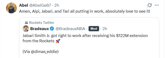 雷速体育7月4日讯 火箭记者Bradeaux刚刚发推特表示,小贾在得到1.22亿美元合同后很快便投入了训练,随后另一名火记Abel转发了这条消息,并表示阿门、申京、小贾与伊森都开始投入训练了,我太爱这一幕了!